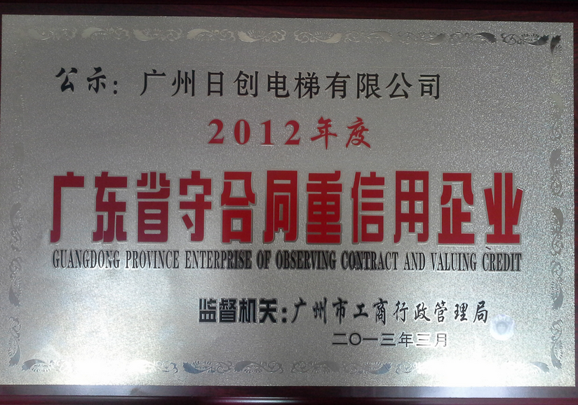 這次獲得的“廣東省守合同重信用企業(yè)”的榮譽是對我們的一種鼓勵,但我們要走的路還很長,未來,我們會更加深入的開展與供應(yīng)商、合作伙伴、客戶的友好誠信合作,堅守誠信的理念,不斷完善合同管理制度,提高公司管理水平,全面提升日創(chuàng)電梯的綜合競爭力和市場形象,與大家一起建立一個更加規(guī)范和諧的市場環(huán)境。