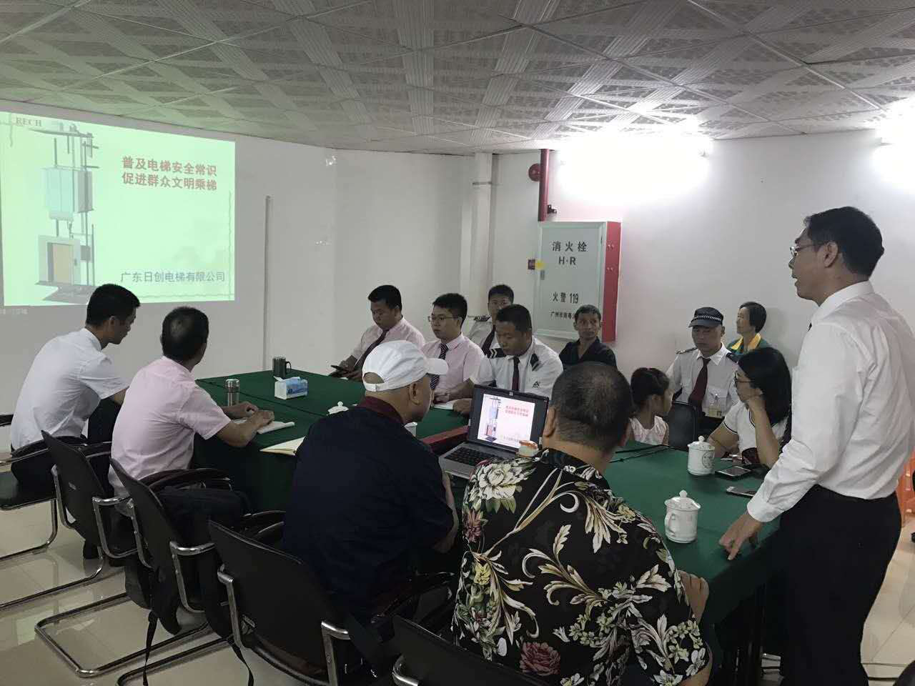 花都雅居樂獅城國際社區(qū)共計(jì)包括日創(chuàng)電梯在內(nèi)50多臺在用電梯。 820日是星期天,高溫炙烤,社區(qū)居民大都閑賦在家。工程部李慶文部長、維保科陳劍華科長與花都維保站的工程技術(shù)人員一行,走進(jìn)花都雅居樂獅城國際社區(qū),對物業(yè)管理公司及社區(qū)居民進(jìn)行科普活動。