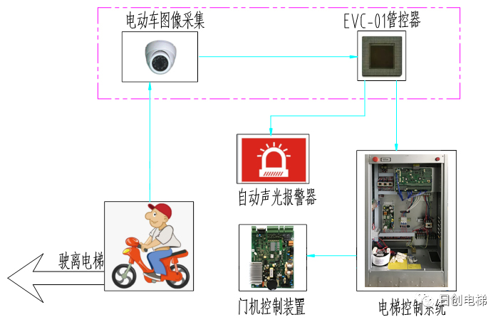 日創(chuàng)電梯EVC-01型電動自行車禁入電梯管控系統(tǒng),運用AI技術(shù),采用機器視覺圖像感知技術(shù),對進入電梯的電動自行車抓拍后進行精準檢測分析,對進入電梯轎廂的電動自行車發(fā)出光聲警告,同時將信號反饋到電梯控制系統(tǒng),控制系統(tǒng)將電梯保持開門狀態(tài),暫停電梯關(guān)門運行。電動車退出轎廂后,系統(tǒng)自動解除警報,電梯自動恢復正常運行。